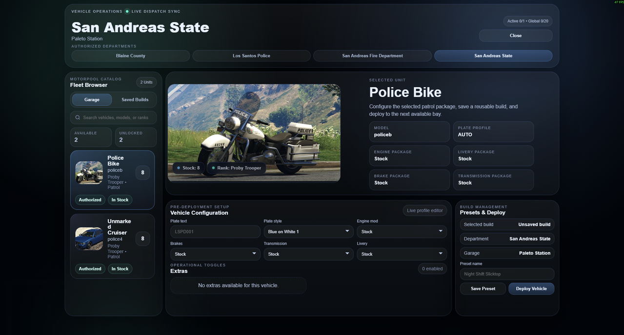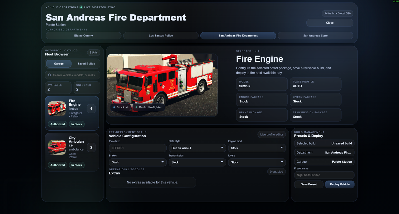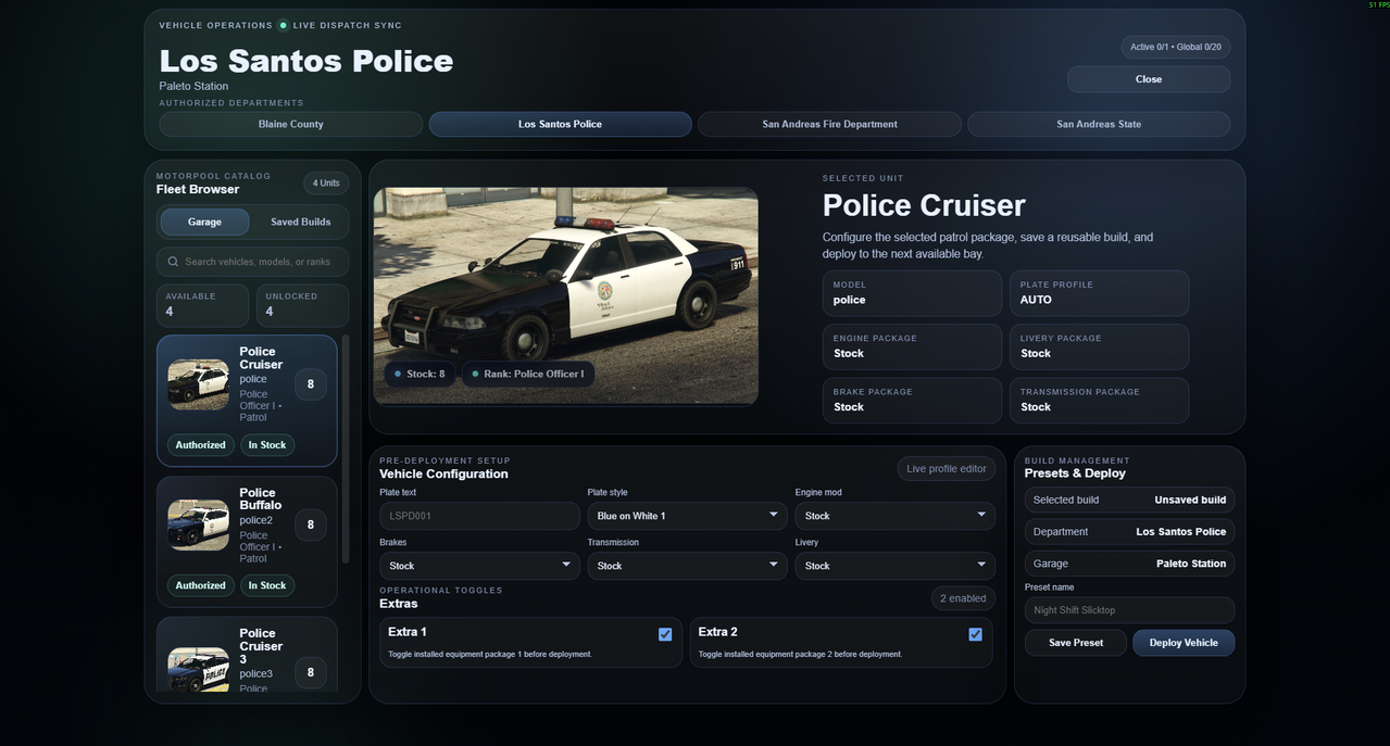 This system is built around department-local ranks, Discord role IDs, and fully configurable garages, while still allowing one garage to show all departments a player has access to.